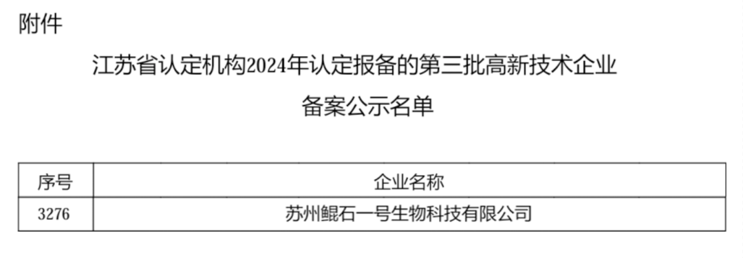 In the latest update, the National Steering Committee Office for High-tech Enterprise Certification has released the "Third Batch of 2024 High-tech Enterprise Certification Filing Public Notice List" as recognized by the Jiangsu Province Certification Authority. Among the companies featured is Suzhou RocRock No.1 Biotechnology Co., Ltd., which has now been officially designated as a "High-tech Enterprise".